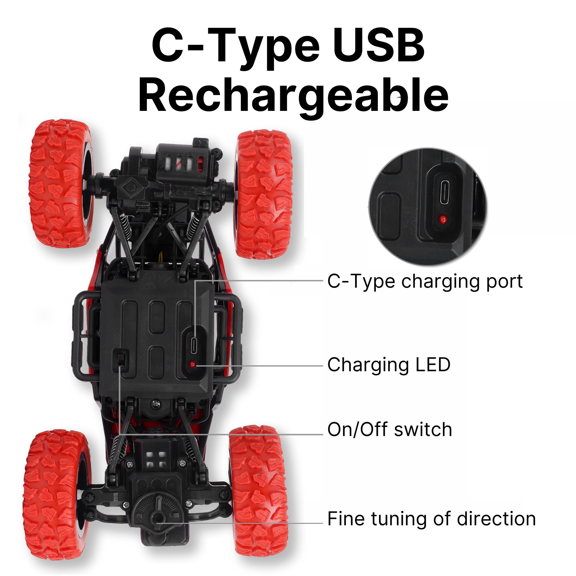INFINI EV Offroader High Speed RC Car with Smoke & Spray | Certified Durable & Safe | Styled as Rock Crawler/Monster Truck | USB C-Type Rechargeable Remote Control Car for Kids | Made in India, Red